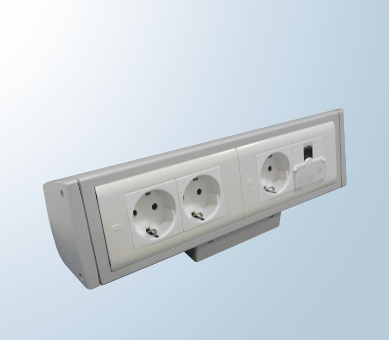 - Tomada e suporte de fixação à calha, com ligadores automáticos.
