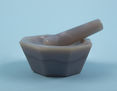 Os almofarizes de ágata Nahita têm uma forma octogonal, e o interior e o pistilo são polidos e isentos de defeitos. A superfície exterior também é lixada uniformemente. Os almofarizes são fornecidos completos com pistilos, que também podem ser adquiridos em separado.