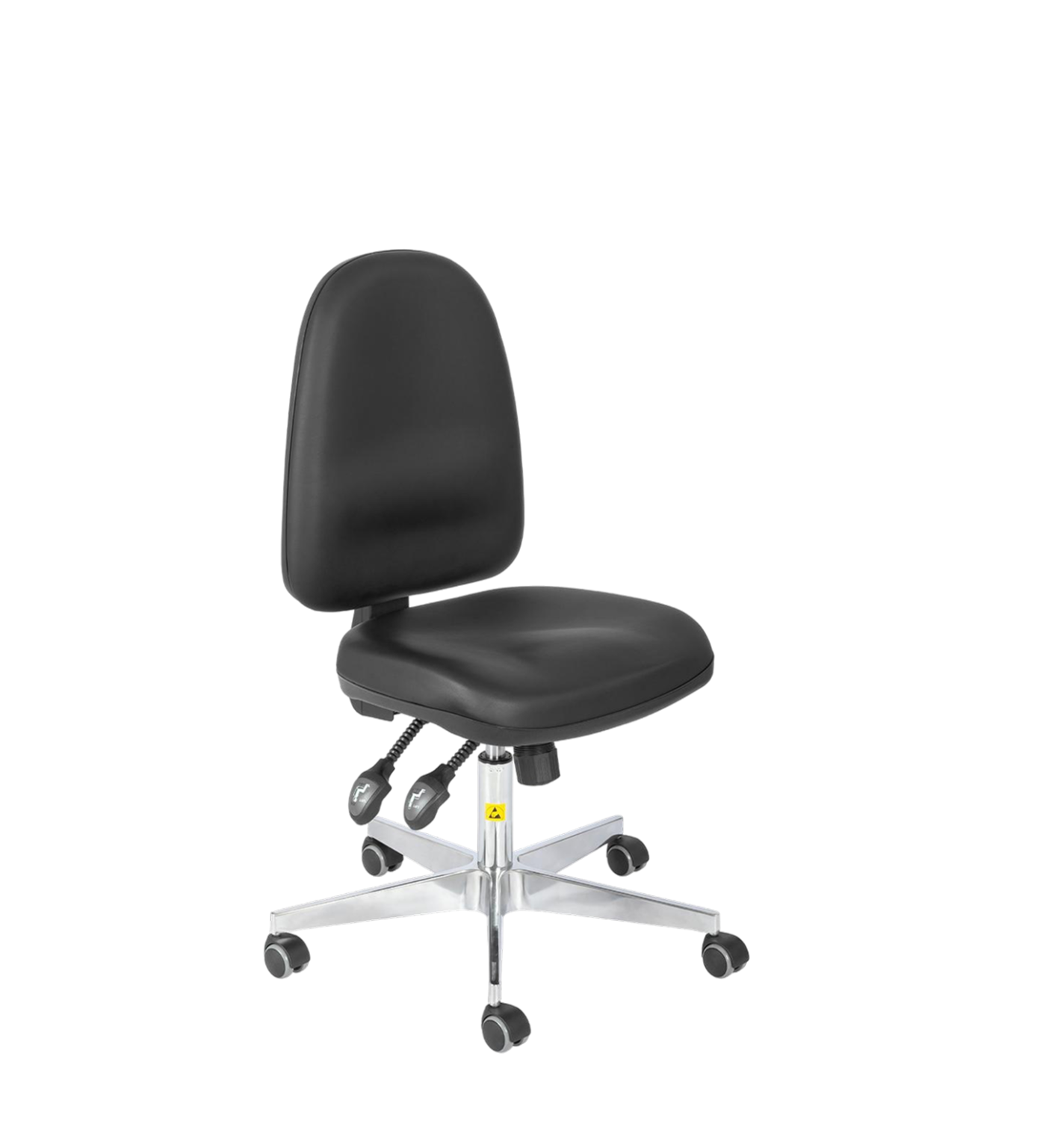 O revestimento da cadeira é fabricado em vinil dissipativo de alta qualidade, resistente à sujidade e fácil de limpar. A elegante e durável base de cinco pontas em alumínio proporciona estabilidade e garante uma longa durabilidade, mesmo nos ambientes mais exigentes.