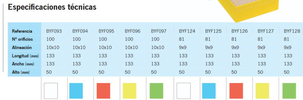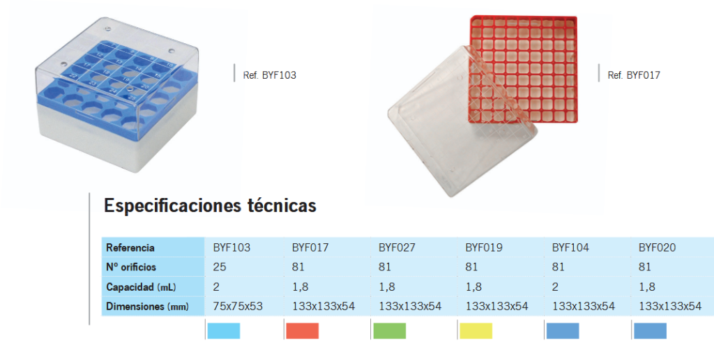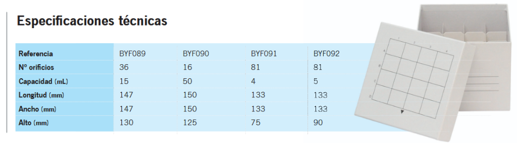 Fabricado em polipropileno de alta qualidade. Para frascos de 2 mL. Resistente a álcoois e solventes orgânicos suaves. Intervalo de temperatura estável: -86 °C a 121 °C.