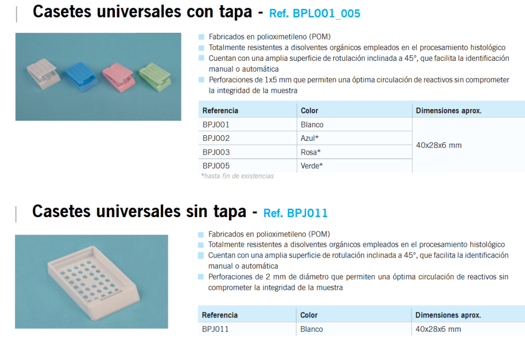 Cassetes para inclusão em parafina, fabricadas em plástico resistente a solventes, compatíveis com os principais sistemas de processamento. Estão disponíveis vários modelos: universal, para amostras standard, e para biópsia, com perfurações mais finas para tecidos pequenos. Estão disponíveis com ou sem tampa e em diferentes cores.