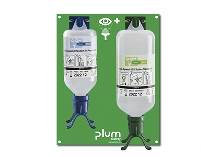 Estação de parede com 500 ml de solução para lavagem ocular Plum pH neutro 4,9% fosfato DUO e 1000 ml de solução para lavagem ocular Plum 0,9% cloreto de sódio DUO.