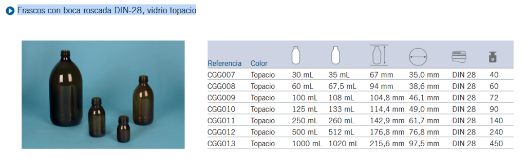 Frascos com tampa de rosca DIN-28, vidro topázio.