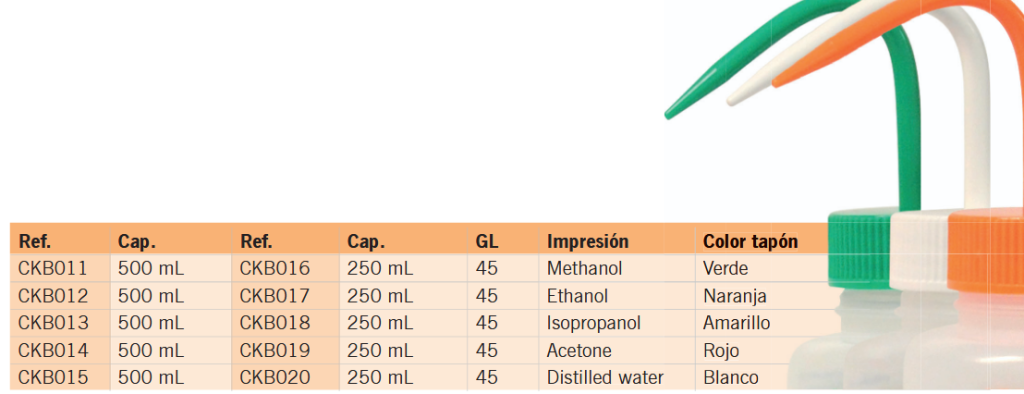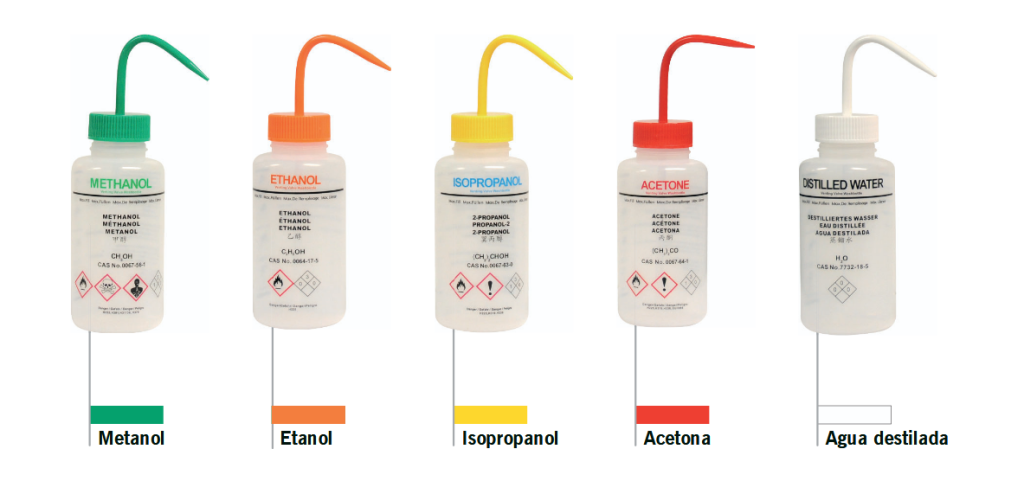 Frasco de lavagem fabricado em LDPE. Impresso com o texto do reagente em inglês, francês, chinês e espanhol.