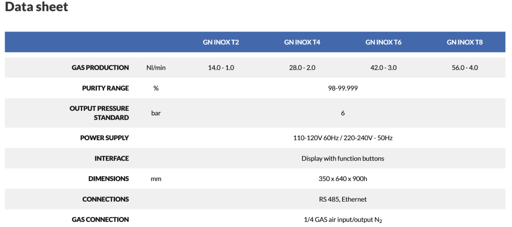 O GN INOX é um gerador de azoto puro (até 99,999%) concebido para garantir um fluxo de gás constante em todas as aplicações que exijam uma atenção especial à higiene, para além da qualidade do gás.