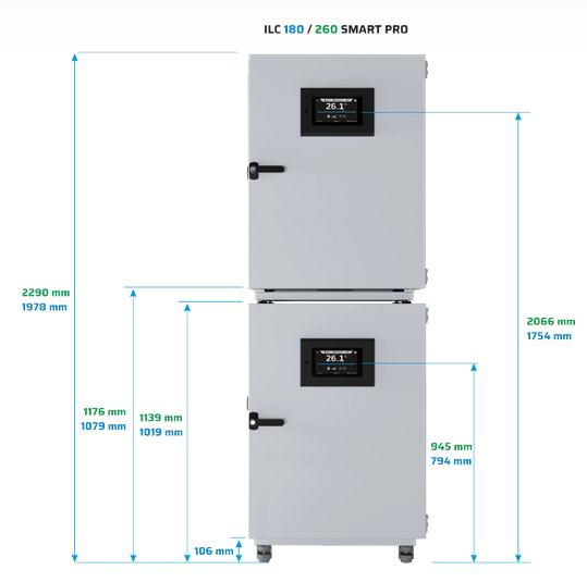 As incubadoras ILC 180/260 SMART PRO podem ser empilhadas umas sobre as outras. Para tal, é necessário um adaptador de empilhamento que evita a transferência de calor, choques e vibrações entre as câmaras. Uma base adicional com rodas facilita a deslocação da incubadora de um local para outro. É também recomendada para proteger o equipamento da contaminação do pavimento.