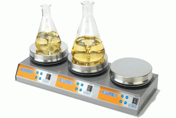 Agitador aquecido multiposição numa única plataforma com 3 posições, uma única ligação elétrica e funcionamento independente de cada posição.