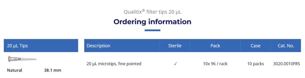 Proteção eficiente contra aerossóis. Inclui filtro hidrofóbico de PEAD com poros de 10 µm para bloquear qualquer contaminante. Certificado com um altíssimo nível de pureza. Ponteiras disponíveis apenas em racks estéreis. Os bastidores de ponteiras vazios podem ser reciclados para utilização com o sistema de enchimento de bastidores Tipfill.