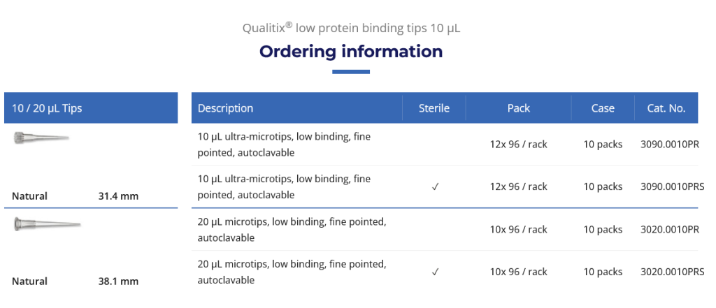 Fabricado com resina isenta de silicone, que reduz a aderência à superfície para proporcionar a máxima recuperação de líquidos. Ideal para pesquisa proteómica e manuseamento preciso de líquidos viscosos. Disponível em racks estéreis ou não estéreis. Os racks e as ponteiras são autoclaváveis. As ponteiras estéreis podem ser autoclavadas, se necessário. Certificado livre de proteases.
