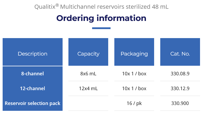 Reservatórios de poliestireno com 8 e 12 canais. Cada canal com fundo arredondado. Capacidade total de 48 mL. Boa estabilidade em bancada. O formato de microplaca permite a utilização com dispositivos de pipetagem automatizados e robotizados, bem como pipetas multicanal.