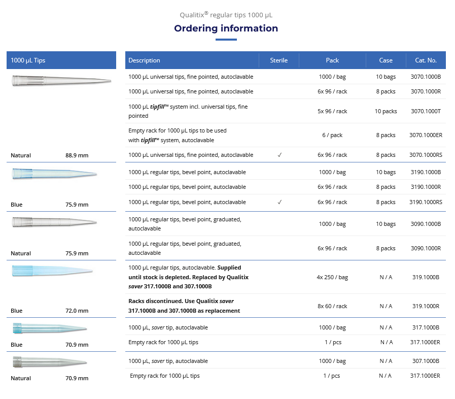 Ponteiras de pipeta de alta qualidade que abrangem volumes de 50 µL a 1000 µL. Encaixe perfeito nas pipetas Socorex® e ampla compatibilidade com outras marcas. Todos os modelos são autoclaváveis. Disponíveis em embalagens, racks e racks estéreis e não estéreis.