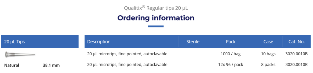 As ponteiras de pipeta de alta qualidade abrangem um intervalo de 0,1 µL a 20 µL. Encaixe perfeito nas pipetas Socorex® e ampla compatibilidade com outras marcas. Todos os modelos são autoclaváveis. Disponíveis em bolsas, racks, estéreis e não estéreis. Fácil acesso a tubos estreitos e profundos, limitando o contacto com a parede do tubo.