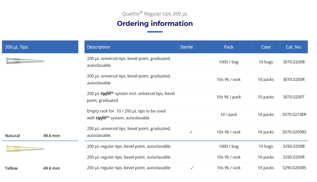 Ponteiras de pipeta de alta qualidade que abrangem volumes de 0,1 µL a 200 µL. Encaixe perfeito nas pipetas Socorex® e ampla compatibilidade com outras marcas. Todos os modelos são autoclaváveis. Disponíveis em embalagens, racks e racks estéreis e não estéreis.