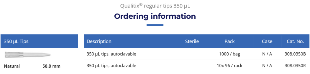Ponteiras de pipeta de alta qualidade que abrangem volumes de 0,1 µL a 350 µL. Encaixe perfeito nas pipetas Socorex® e ampla compatibilidade com outras marcas. Todos os modelos são autoclaváveis. Disponíveis em embalagens, racks e racks estéreis e não estéreis.