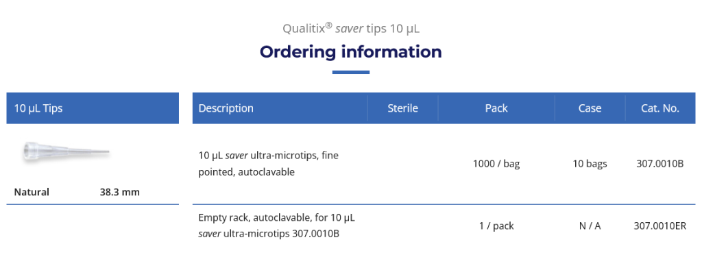 Ponteiras de pipeta em polipropileno de alta qualidade para pipetas de 0,1 µL a 10 µL a um preço mais acessível. Encaixe perfeito em pipetas Socorex® e ampla compatibilidade com outras marcas. Disponíveis em embalagens individuais. Todos os modelos são autoclaváveis. Para facilitar o manuseamento, podem ser adquiridos racks autoclaváveis vazios para enchimento manual.