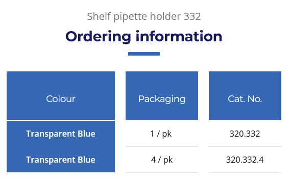 O armazenamento adequado das micropipetas previne danos e prolonga a sua vida útil. O design atrativo acomoda todas as micropipetas, macropipetas e pipetas multicanal da Acura®, bem como as micropipetas dispensadoras. Uma fita autocolante incluída garante uma fixação duradoura em qualquer superfície limpa. Fabricado em policarbonato azul.