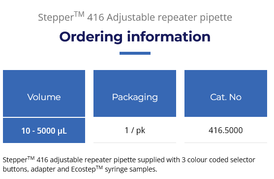 A mais recente geração de pipetas repetidoras foi concebida para dispensar com precisão volumes de 10 a 5000 μL. O mecanismo de acionamento exclusivo elimina a fadiga do polegar. Os materiais selecionados oferecem uma excelente resistência ao impacto. O formato compacto limita significativamente a contaminação interna do instrumento. Vasta seleção entre 53 volumes diferentes; até 73 doses por enchimento. Dois anos de garantia.