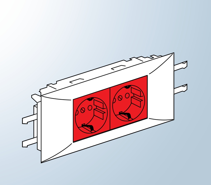 - Tomada e suporte de fixação à calha, com ligadores automáticos.